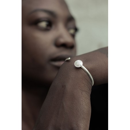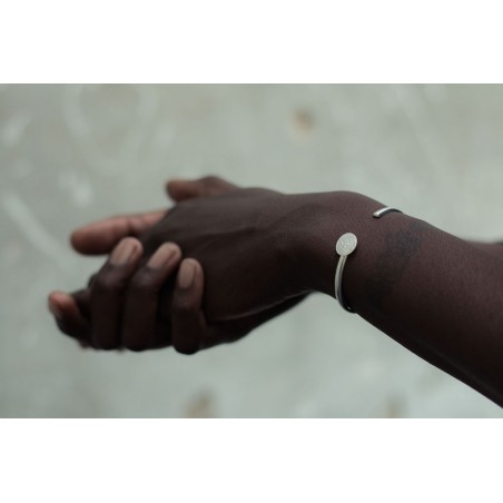 La manchette minimaliste Tohil en argent 925 est élégante et sauvage grâce à son asymétrie et sa pastille texturée à souhait.