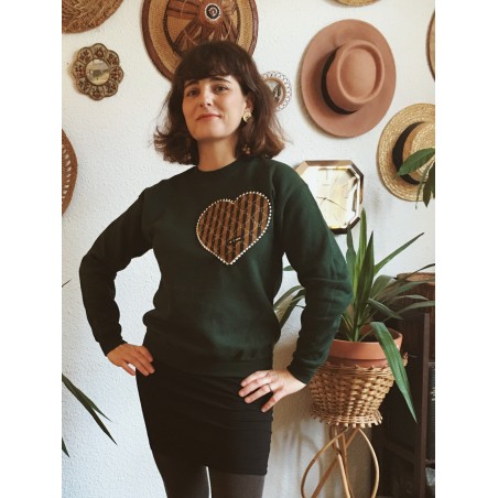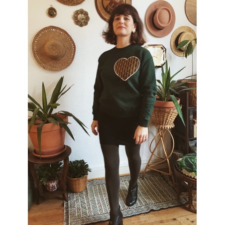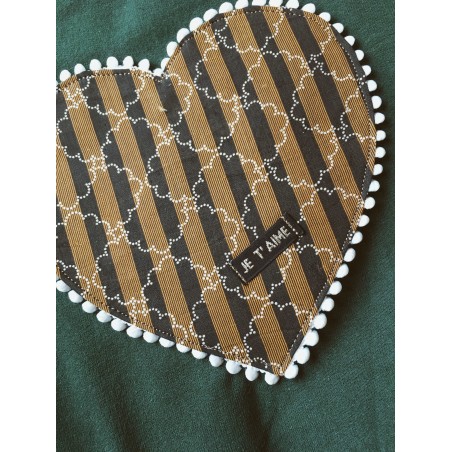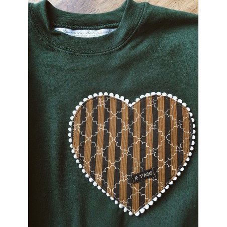 Sweat vert sapin de la nouvelle collection JE T'AIME du Bivouac des gazelles. Ce sweat est customisé d'un cœur sur lequel est inscrit JE T'AIME en doré. Le cœur est confectionné avec du tissu chiné du 18ème siècle. 50 % coton 50 % polyester. Taille 36.