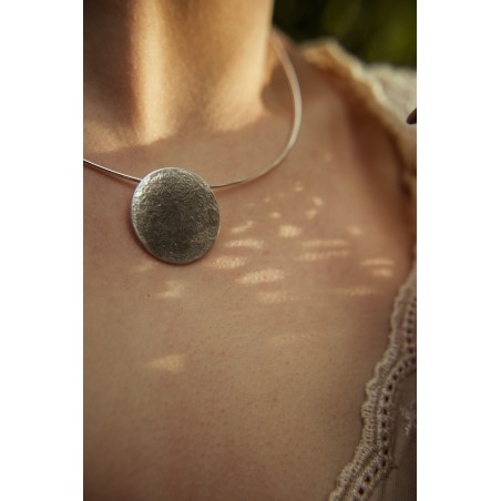 Le pendentif est fabriqué à partir d'une plaque d'argent de 0.7mm d'épaisseur et de 2.5 cm de diamètre. La chaîne mesure environ 42cm.